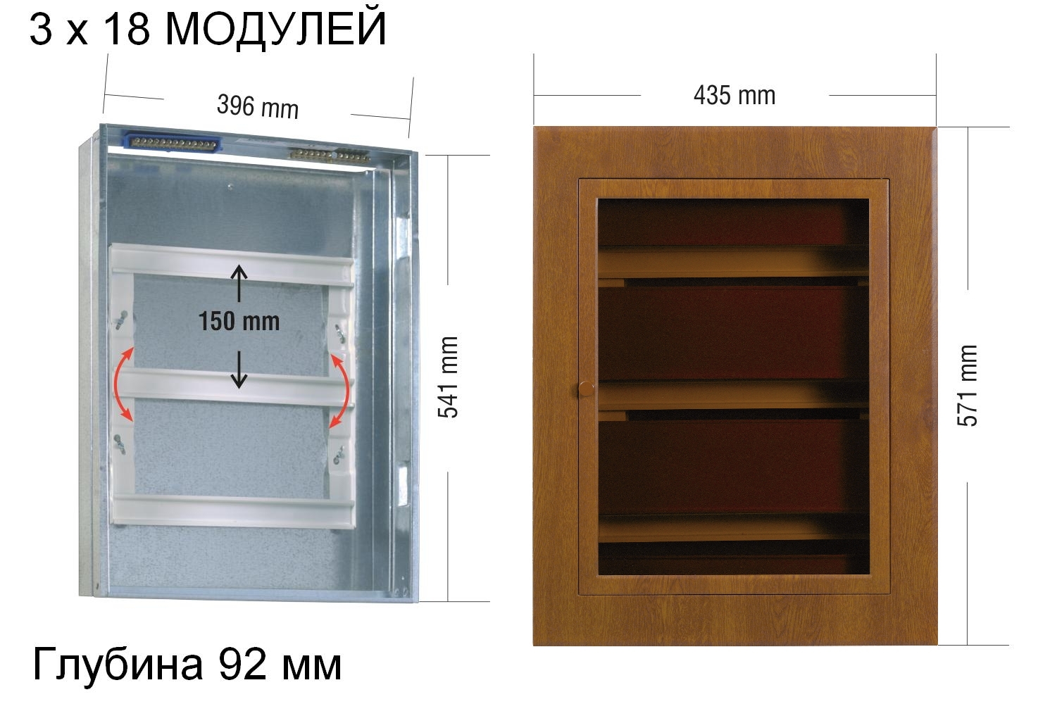 | Вместимость щита: 54 модуля (3 ряда по 18 модулей) |